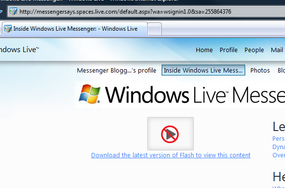 Aside: Same issue with internal adoption of Microsoft’s standards. The Inside Windows Live Messenger blog, has flash at the front, instead of Silverlight. I would have thought, since Messenger 9 has sprinkles of WPF, Silverlight would be a no brainer.