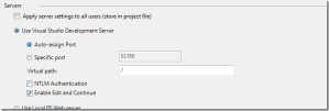 This was irritating, but didn’t really bother me because I could work around it quite quickly. I opened the Web properties of the ASP.NET Web Application project (right click the project, select Properties and then the Web tab on the left) and set it to run from the Local IIS (Internet Information Services) Web server. The only issue this had was I must run Visual Studio as an Administrator since I have User Account Control (UAC) enabled, and I don’t get Edit and Continue.