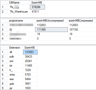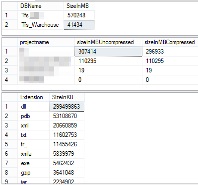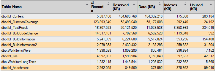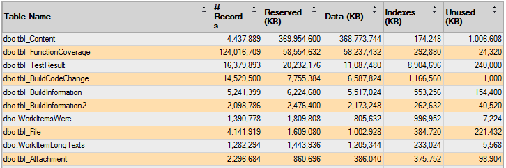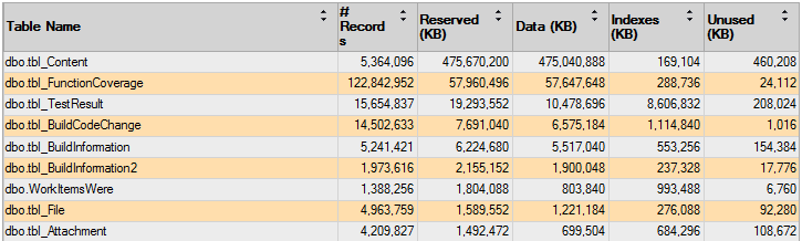 I then came across the comprehensive post by Terje Sandstrom. The also contained some queries for TFS 2012 to determine the attachment content size. Here’s where it doesn’t make sense. The report table size from the disk usage report, does not match up, whatsoever, against what these queries returned. And the query from Grant Holliday showing monthly usage again show huge amounts of data (60GB per month) in a table that is 680MB. Who is correct, SQL Server reports or table queries?