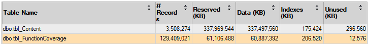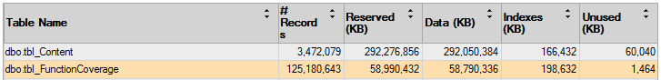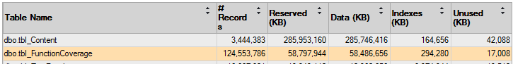 This got me to check out my source into a clean workspace and running Space Sniffer against it to spot if anything big had been added. Our entire source is about 50 GB. Which sounds like the total size isn’t too far off. But Main is only 820 MB and the whole team is working on there. We have been doing lots and compared to a 4 months ago it was 730 MB. We have many branches but that should only be less than a GB per branch and being a delta it should be next to nothing. Checking the tbl_Content table itself showed that the biggest rows were years old and no new large binaries have been added.